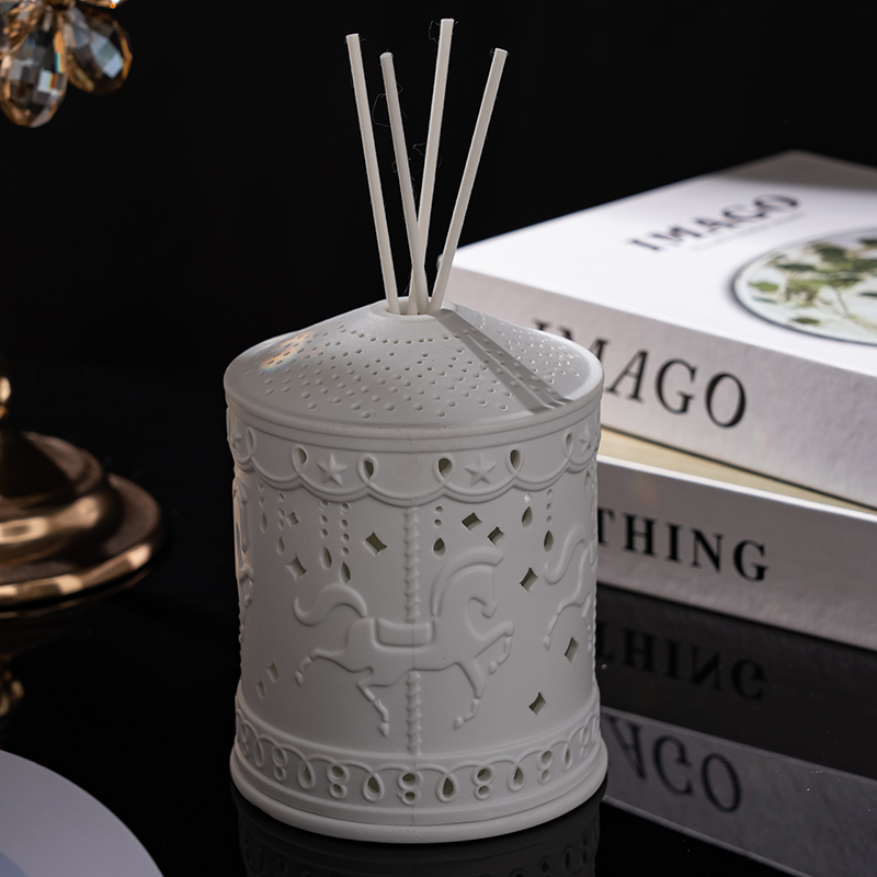 | Detail Description | 1380℃ high-fired matte porcelain; laser-cut rotating-horse perforations cast dynamic shadows and enhance fragrance diffusion. Versatile 4-in-1 use: candle holder, oil warmer, reed-diffuser vase, or scent-stone cage. Ready-to-gift ceramic box makes instant holiday or house-warming present. |