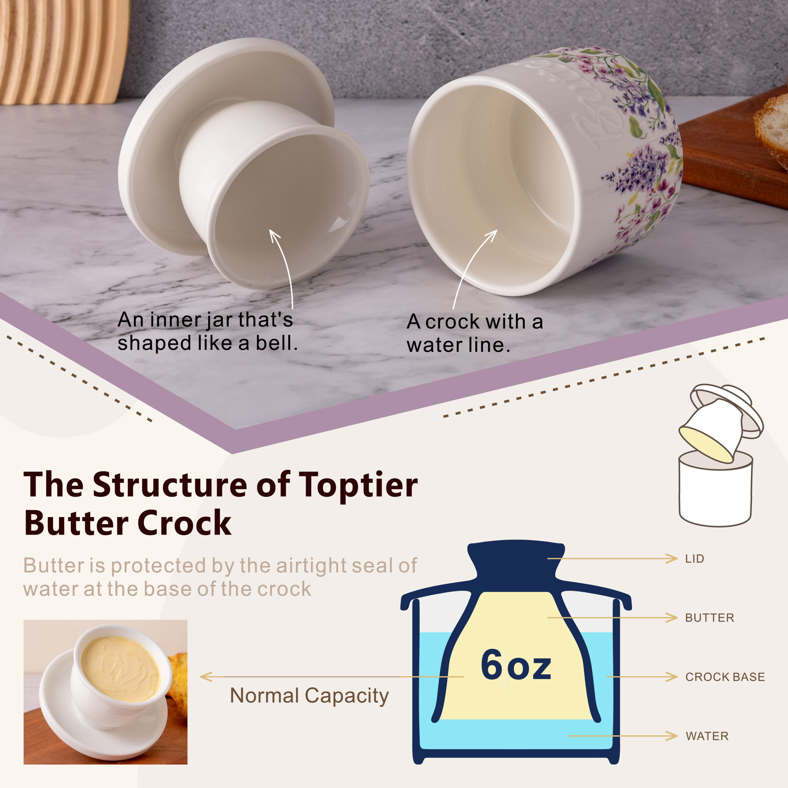 | Detail Description | Lead-free porcelain with high temperature fired decal and raised “butter” relief; water-seal lid keeps butter fresh & spreadable for weeks without refrigeration. Stain-resistant polished finish, easy-pack 150 g capacity, doubles as decorative crock. |