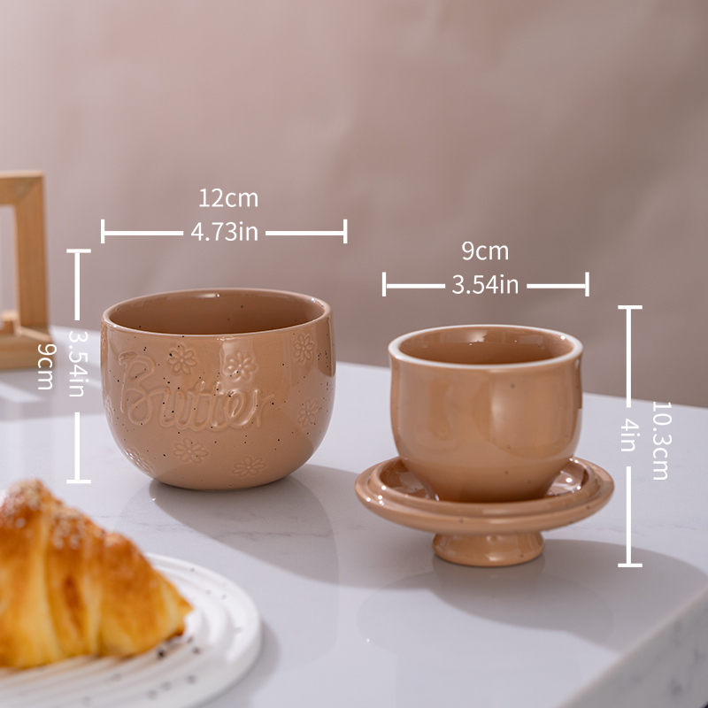 | Detail Description | Lead-free ceramic with raised floral motifs & “Butter” script; available in White, Brown, Sage Green. Water-seal base locks in freshness—no refrigeration needed. Lid packs 8 oz softened butter; simple 3-step use: fill water to line, pack lid, invert. Doubles as elegant table centerpiece. |