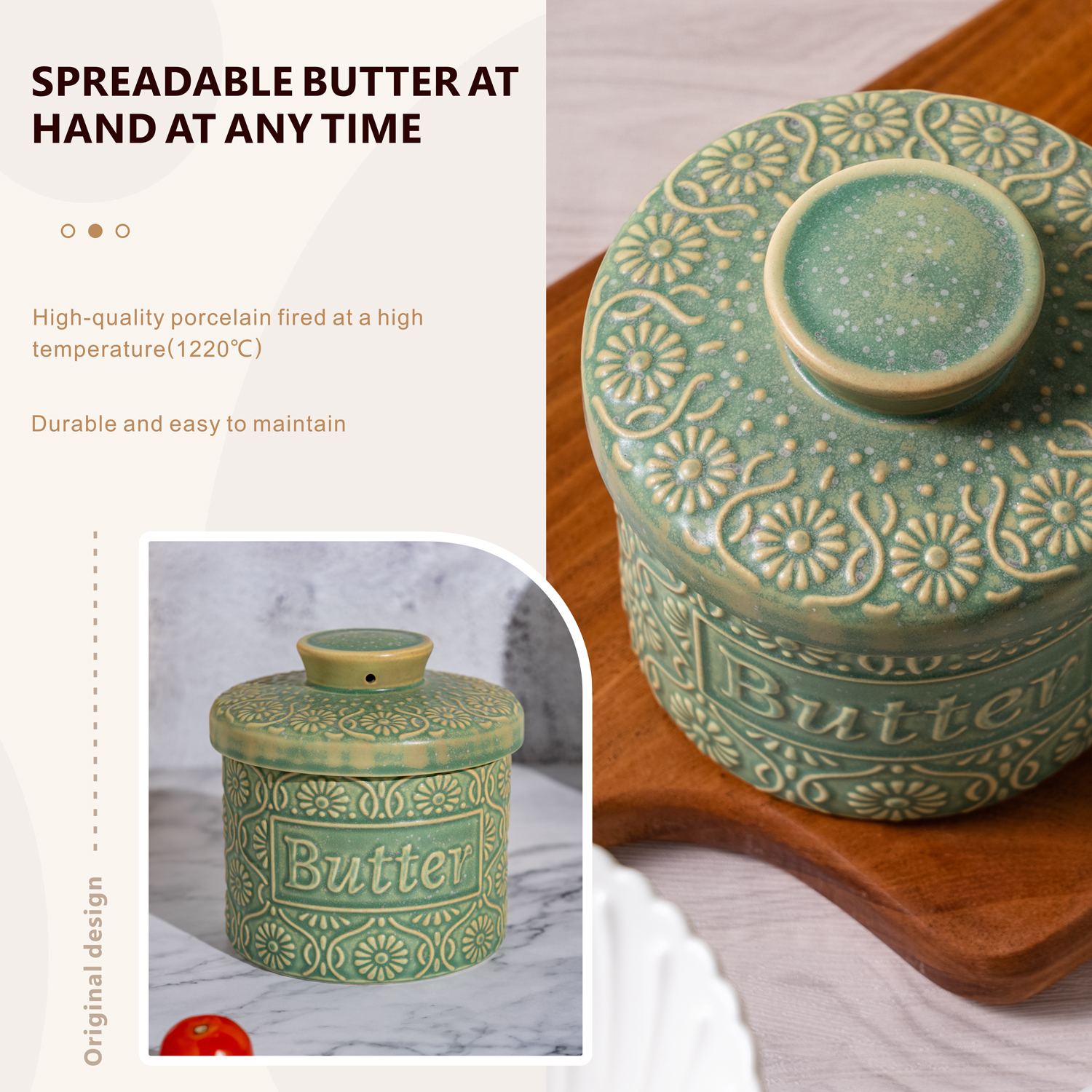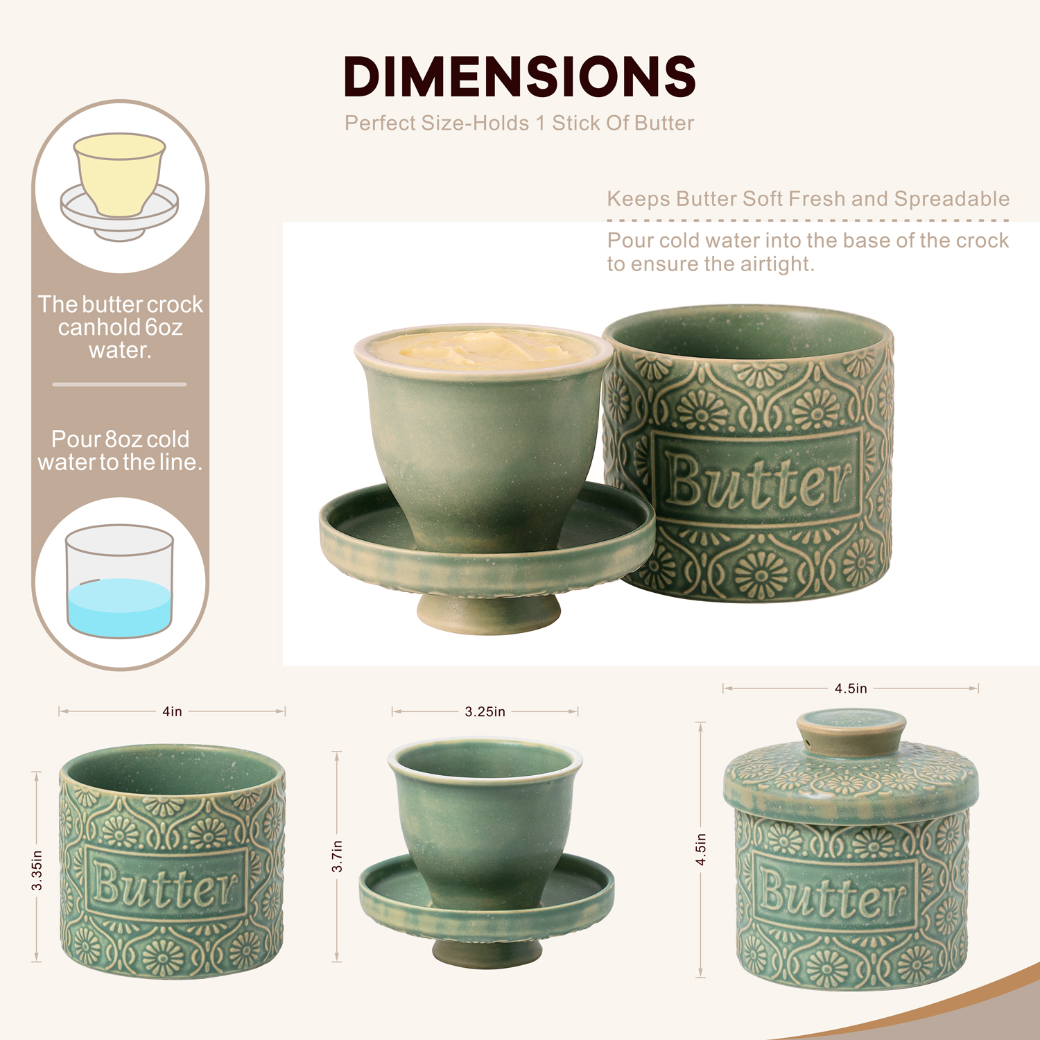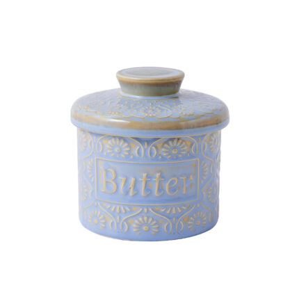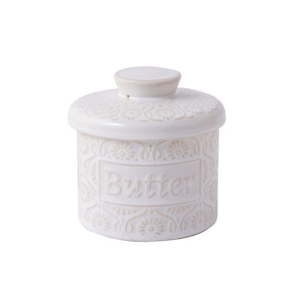 | Detail Description | Authentic French-style butter crock in high-fired ceramic with lead- & cadmium-free reactive glaze; each piece shows unique color variations. Relief “butter” lettering and decorative patterns add rustic charm. Water-seal lid keeps butter fresh and spreadable for weeks without refrigeration. |