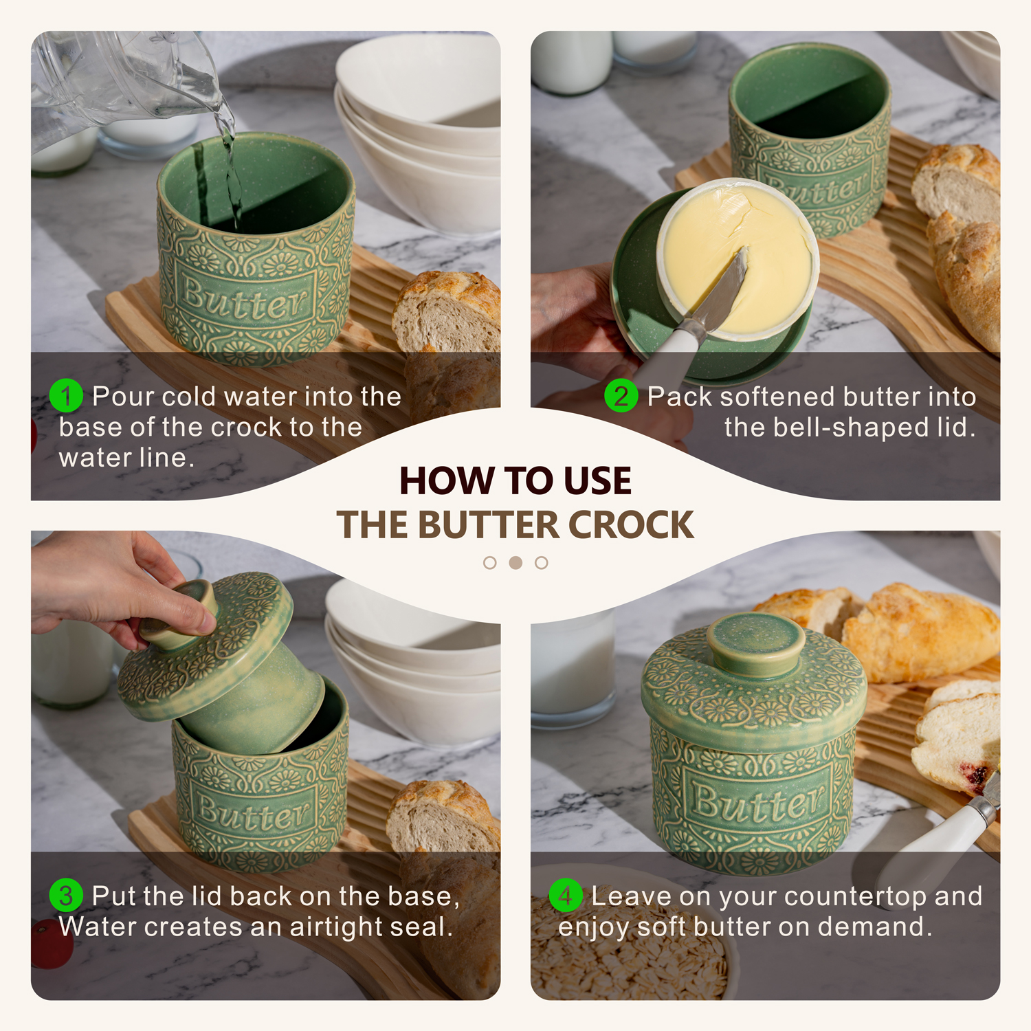 | Care & Warnings | Dishwasher safe; replace water every 2-3 days; keep crock in a cool, dry place away from direct sunlight; use unsalted butter for best preservation |