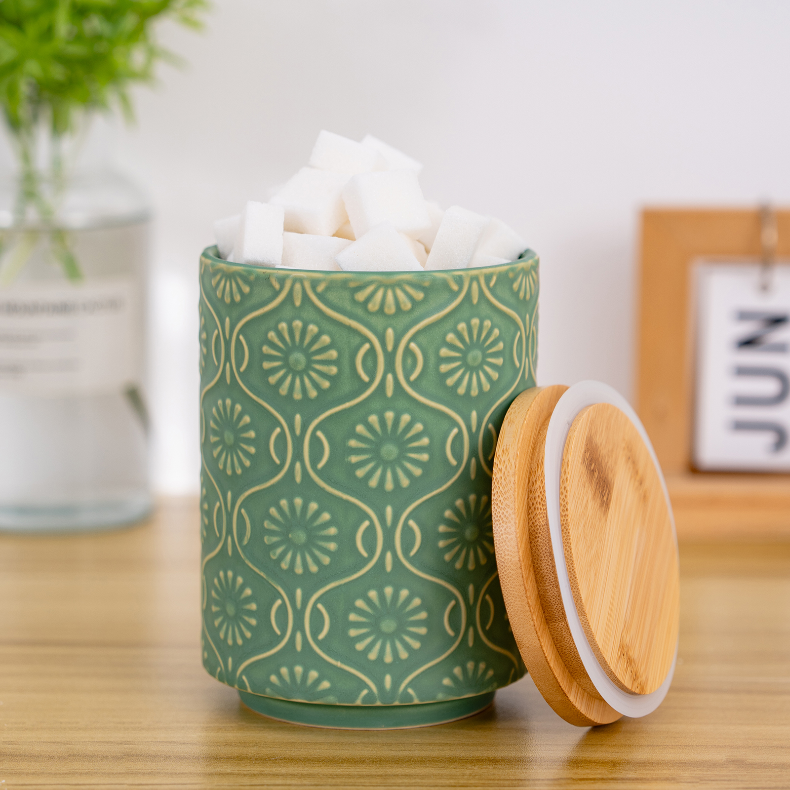 | Detail Description | Embossed reactive glaze ceramic in 5 colors (White, Green, Light Blue, Navy Blue, White Garden). Airtight bamboo lid with silicone ring locks out moisture & air. Compact 30 oz footprint fits any counter. Easy-seal tip: press air-vent side last for perfect closure. Tidy, fresh, stylish. |