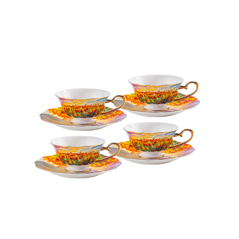 Fine Bone-China Tea Cup & Saucer Set – 160 ml, 24K Gold Handle,Tulip Garden – 4 cups & 4 saucers (FOR SAMPLES ONLY)