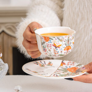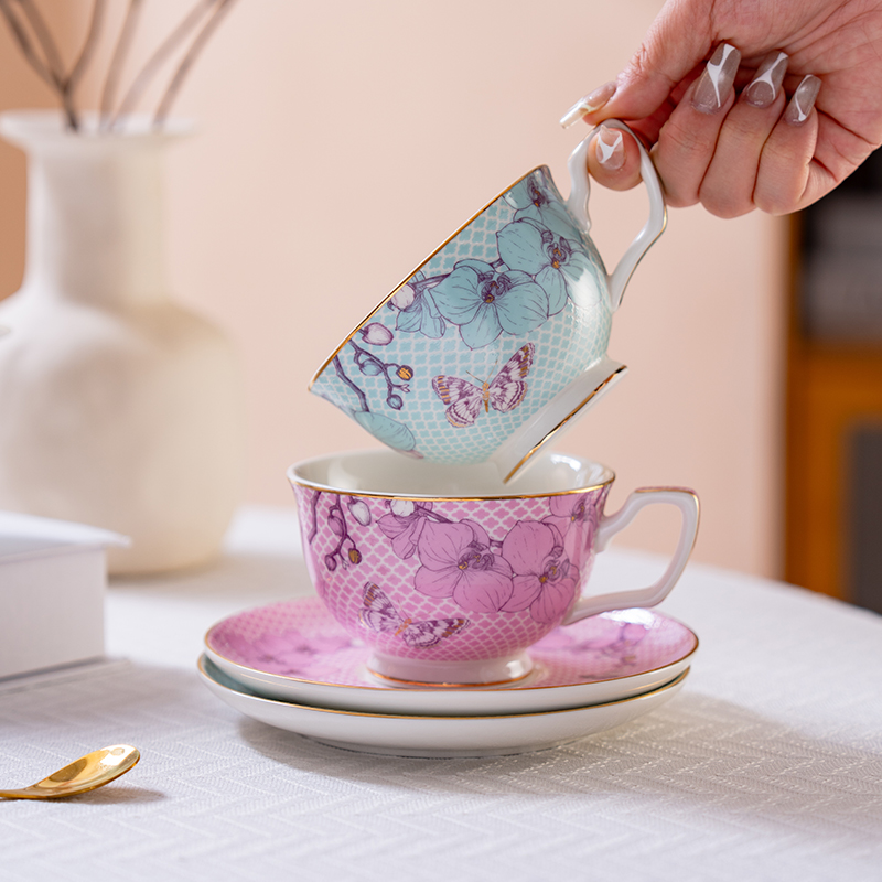 Detail Description High-fire (≥1 250 °C) lead-free porcelain, chip-resistant. Raised floral decals + hand-painted 24 k gold knob and rim. Pastel two-tone palette (soft pink & powder-blue). Ready-to-gift packaging: ribboned box + carry bag